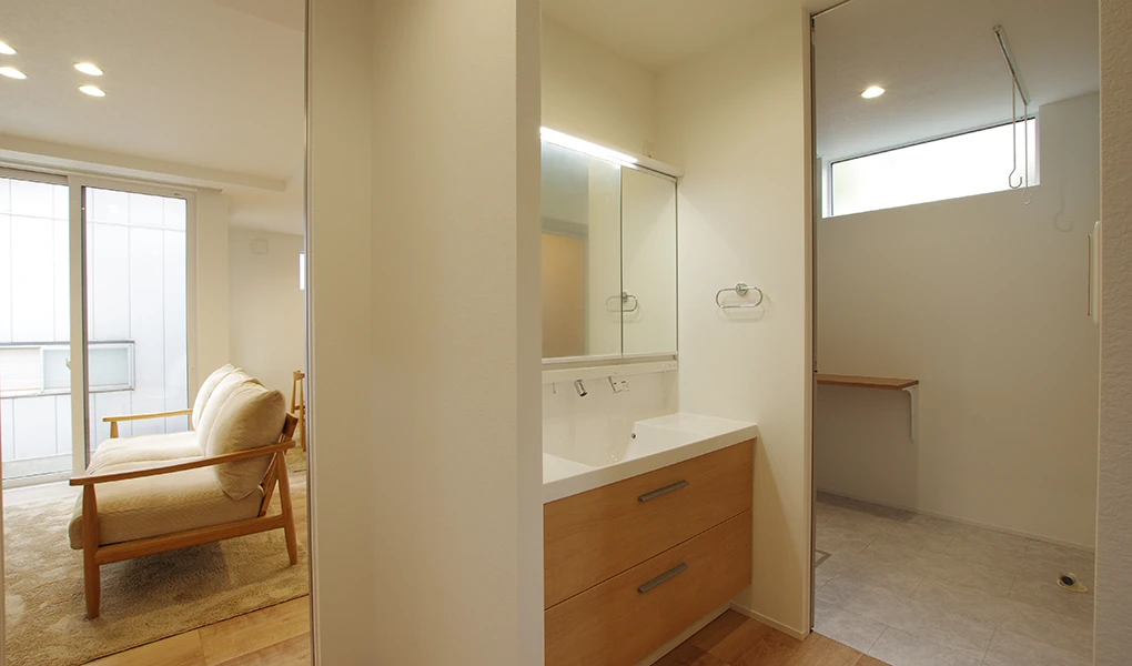 「洗う・干す・しまう」が5歩以内で完結する、1階家事完結型の間取り。玄関ホールに幅広の洗面台がるため、帰宅後すぐに手洗いができるのもポイント◎