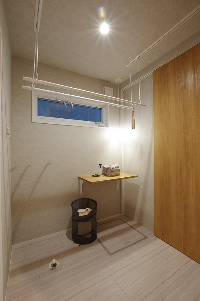 1階で「洗う・干す・しまう」が完結する家事ラクの水回り。家族で使いやすい幅広の洗面台を設置し、帰宅後すぐに手洗いができる動線になっています。