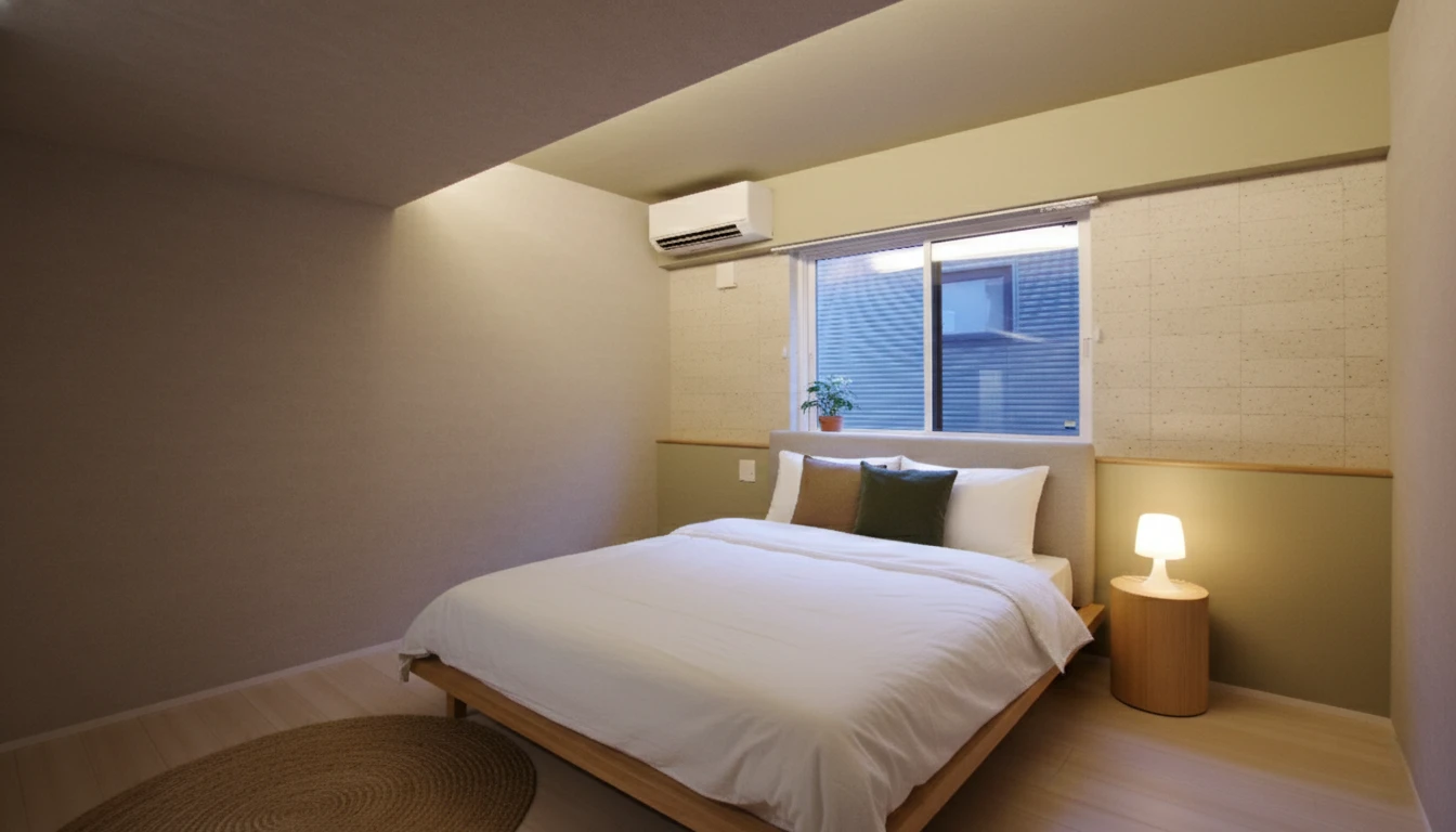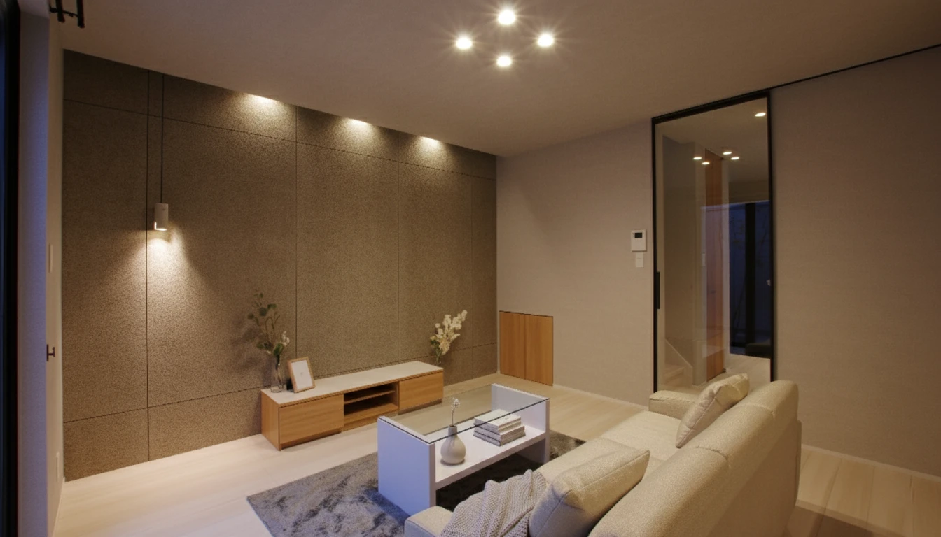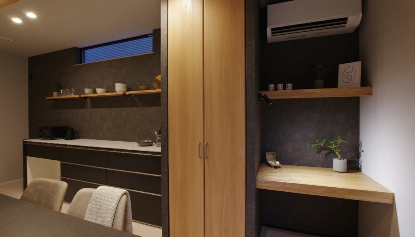 内装には大谷石のクロスやペンダントライトを採用し、ブラックと木目を組み合わせたことで落ち着いたモダンな旅館を思わせる雰囲気に。壁面を有効活用したニッチもポイントです。