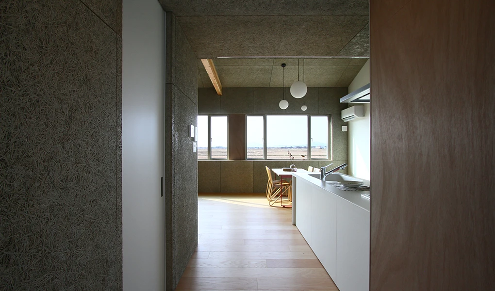 玄関からLDKまでオープンにつながる設計を活かしつつ、玄関の冷気をシャットダウンするためのレースカーテンをホールに設置。自然豊かな住環境に合わせて、自然素材の仕上げ材(ラワン合板・木毛セメント板・麻のカーテンなど)でコーディネートしているのもポイント。