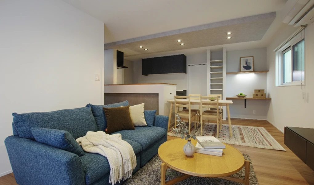 落ち着いたカラーの床材や建具、シックなキッチンを採用。ポイントにグレー系のアクセントクロスも取り入れつつ、暗い印象にならないようバランス良くカラーコーディネートしました。